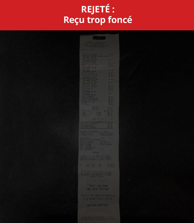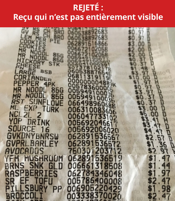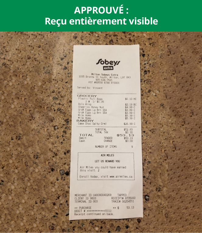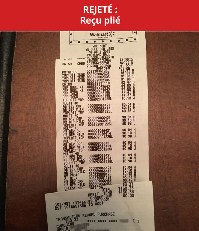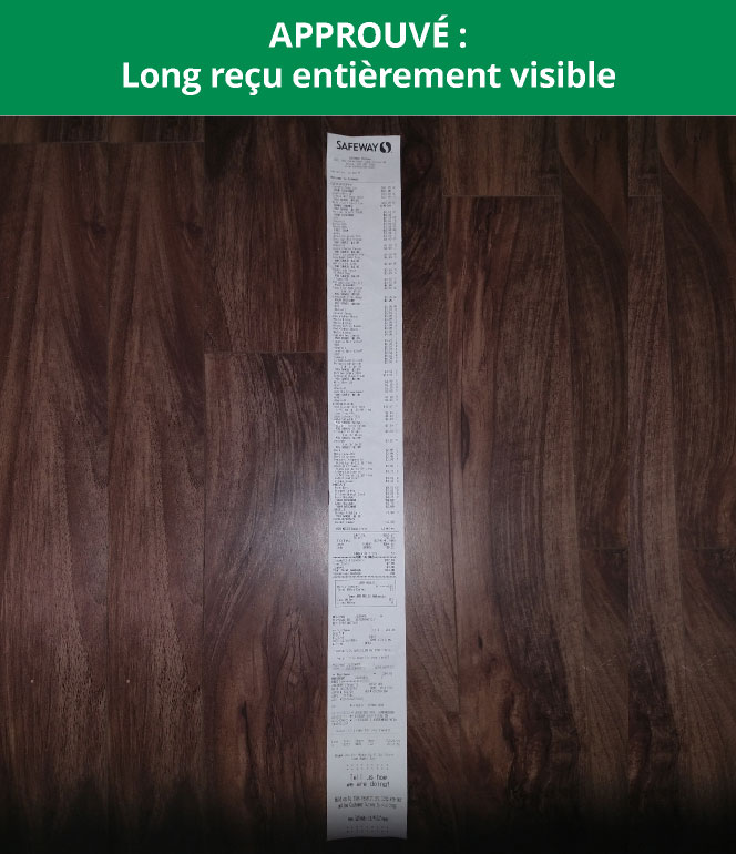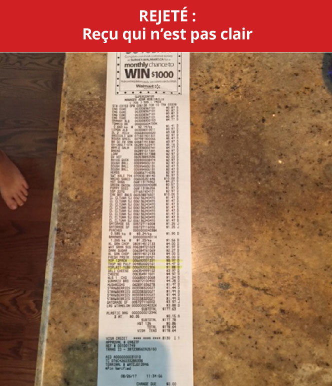 - Avant de soumettre l’image, EXAMINEZ LE REÇU : assurez-vous qu’il est CLAIR et que tous les produits et éléments requis sont facilement repérables.